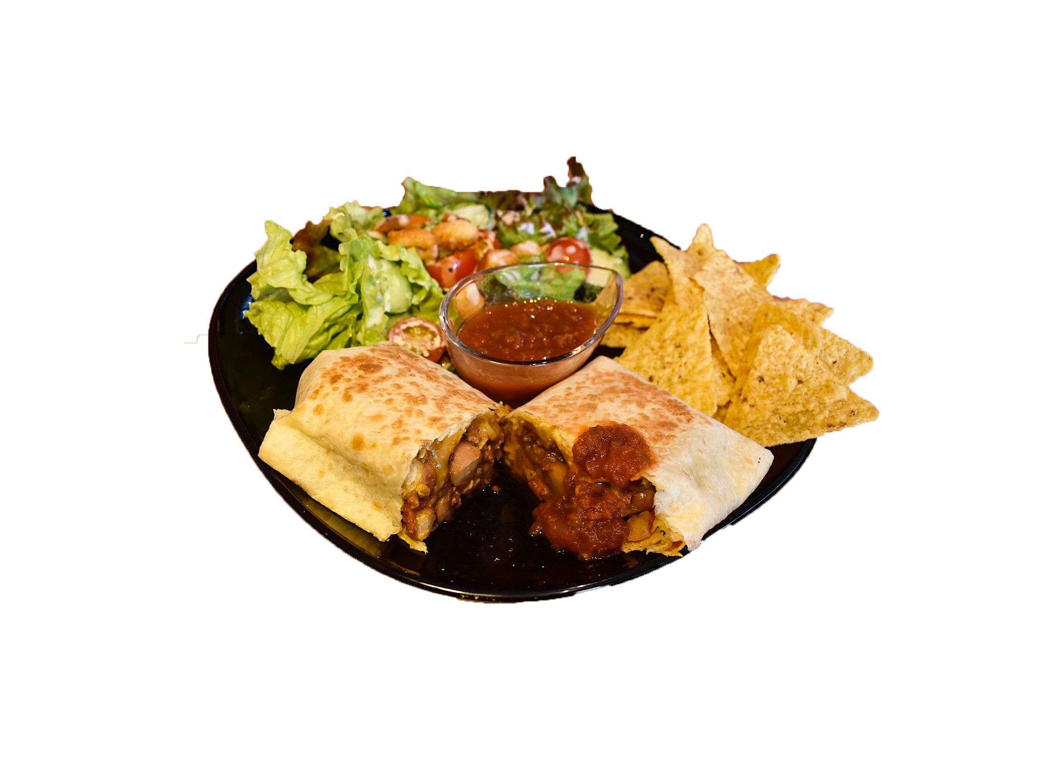 チリビーンズとチーズをトルティーアで包んでサルサと一緒に